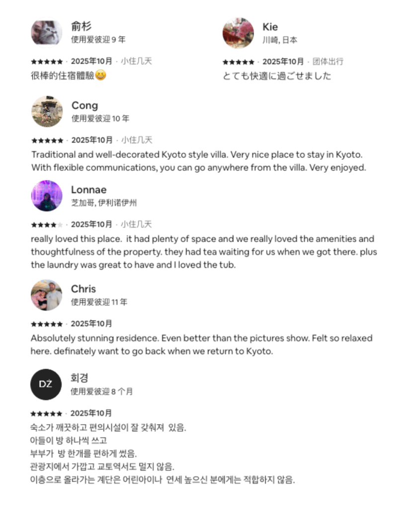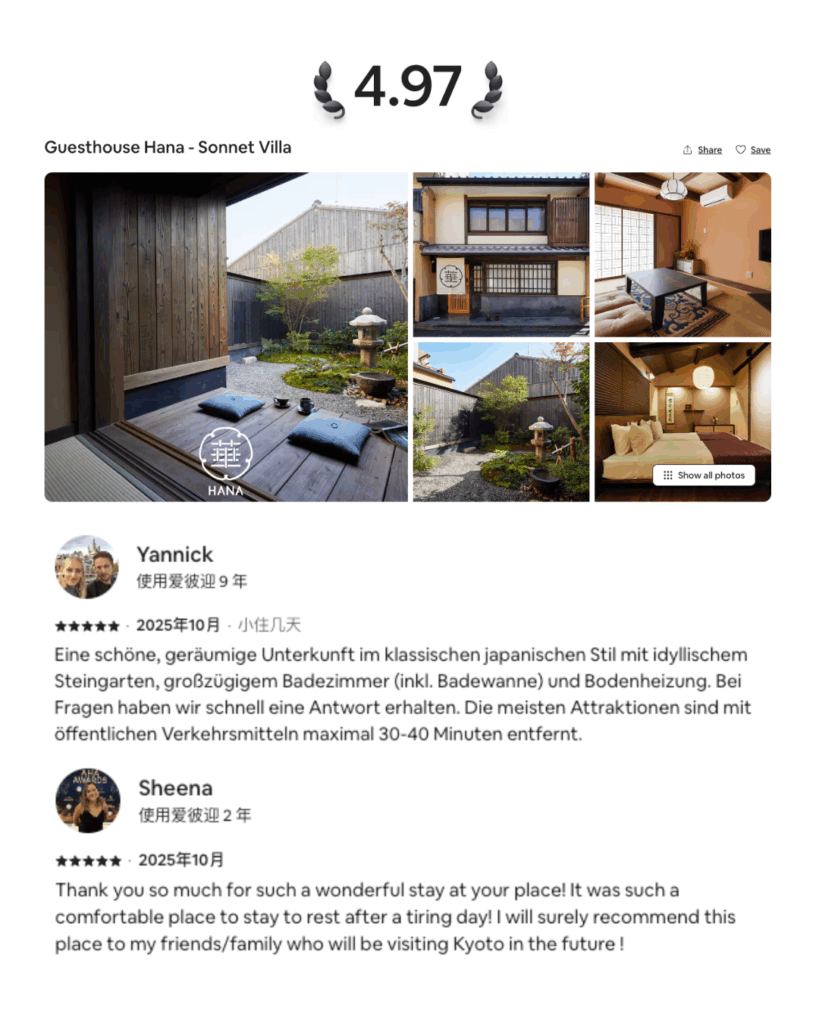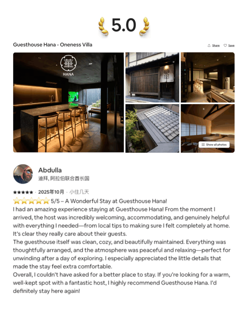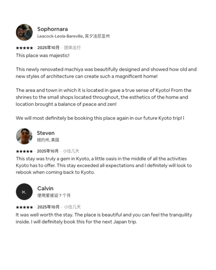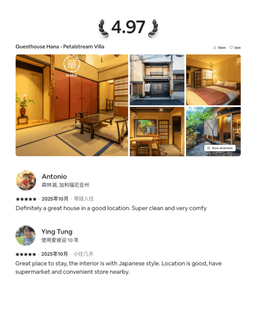 值得一提的是,十月新上线的「瓢箪」 也顺利迎来了第一条住客评价,并取得了 满分 5 分 的开门红。我们对这座兼具传统风韵与现代舒适的京町家未来的表现充满期待。