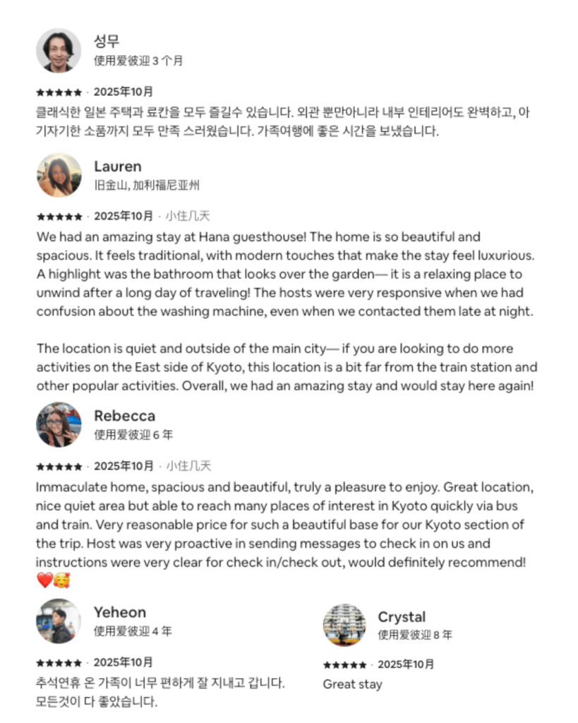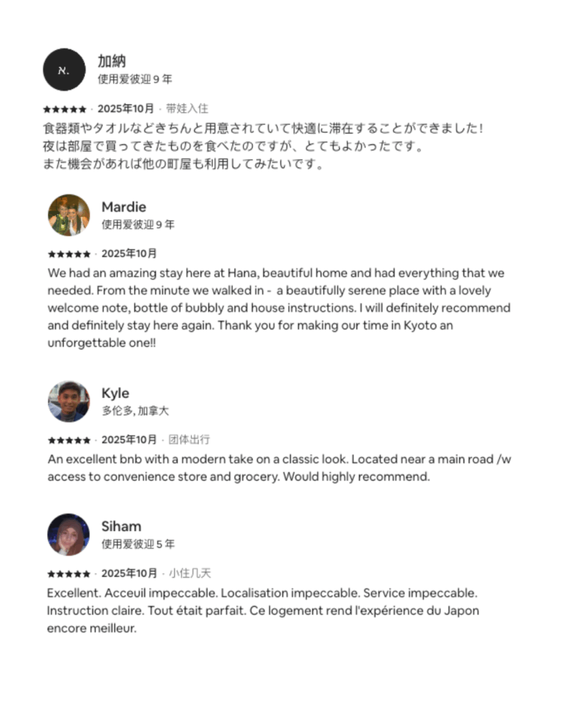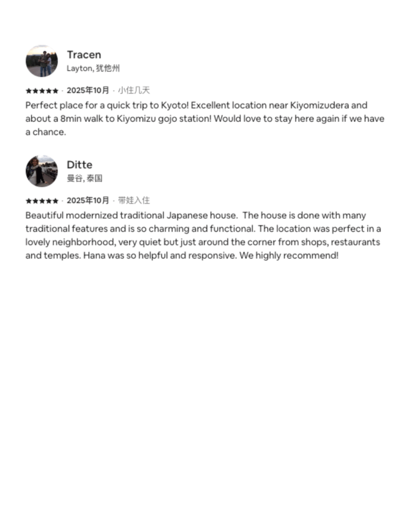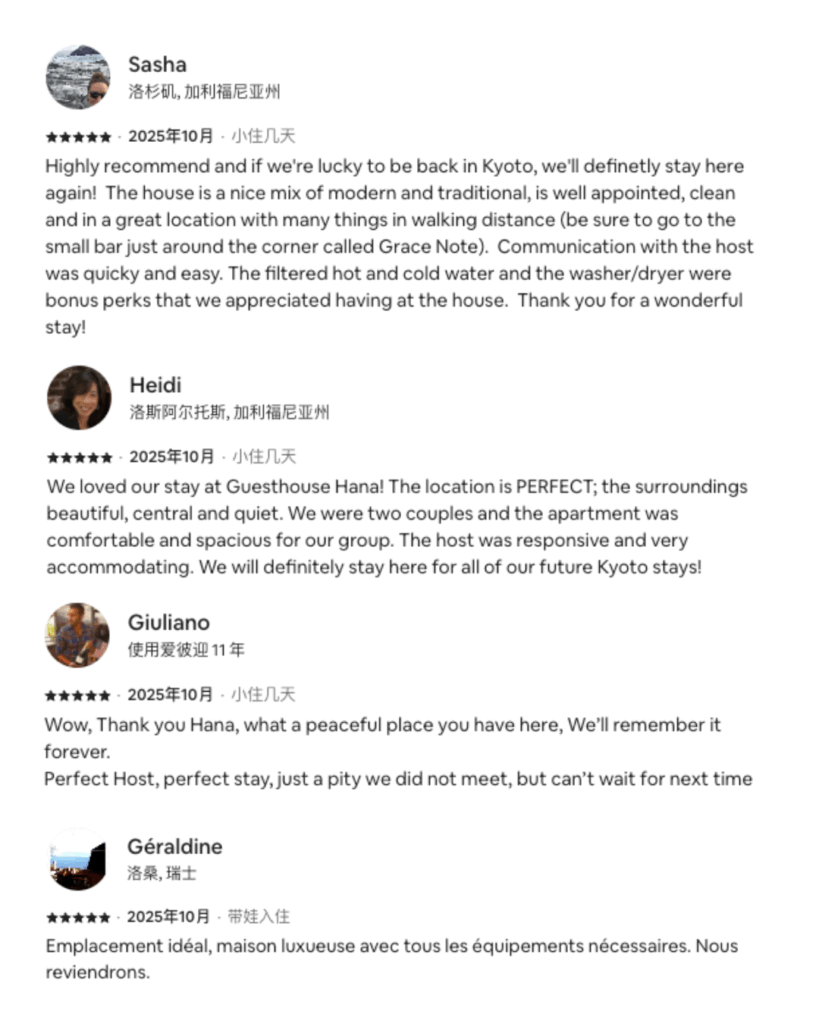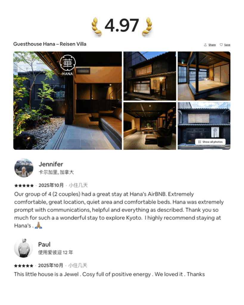 非常感谢所有选择入住 Hana 系列町家的旅人。你们的声音是我们不断前进的动力,我们将继续以最真诚的心,为每一位来京都的旅行者创造更美好、更安心的入住体验。