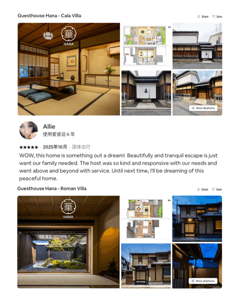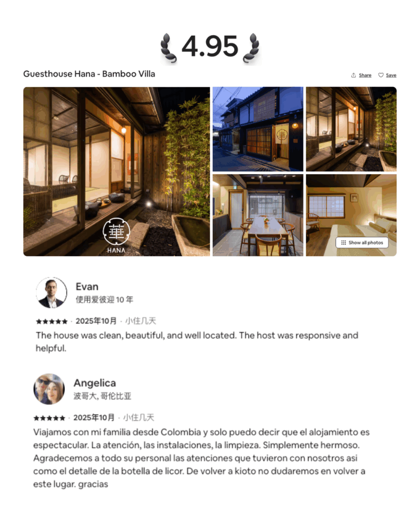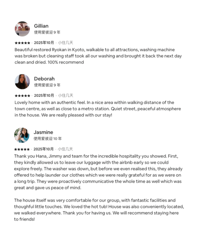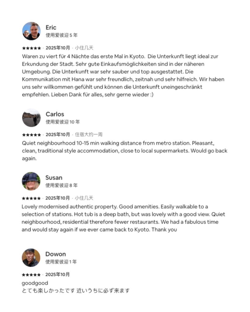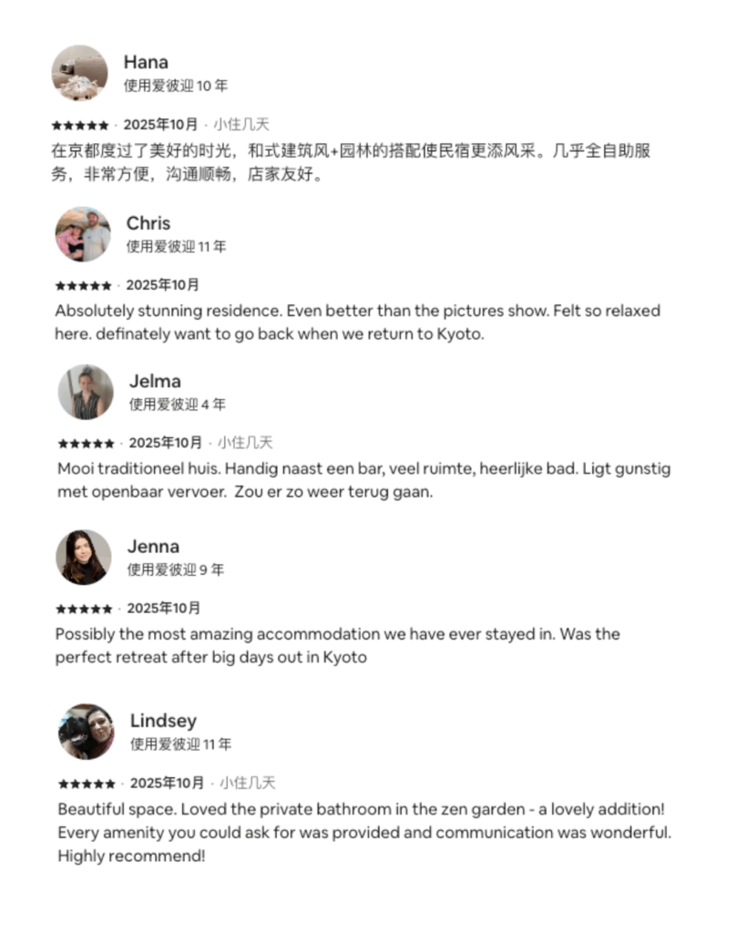 非常感谢所有选择入住 Hana 系列町家的旅人。你们的声音是我们不断前进的动力,我们将继续以最真诚的心,为每一位来京都的旅行者创造更美好、更安心的入住体验。