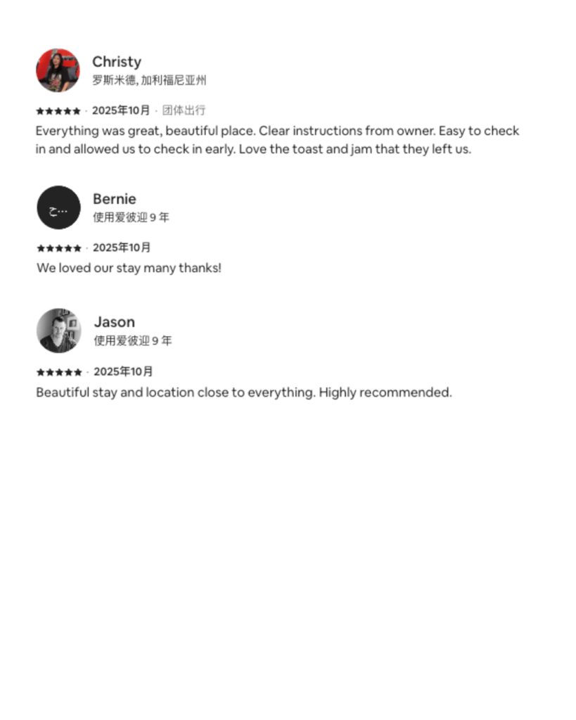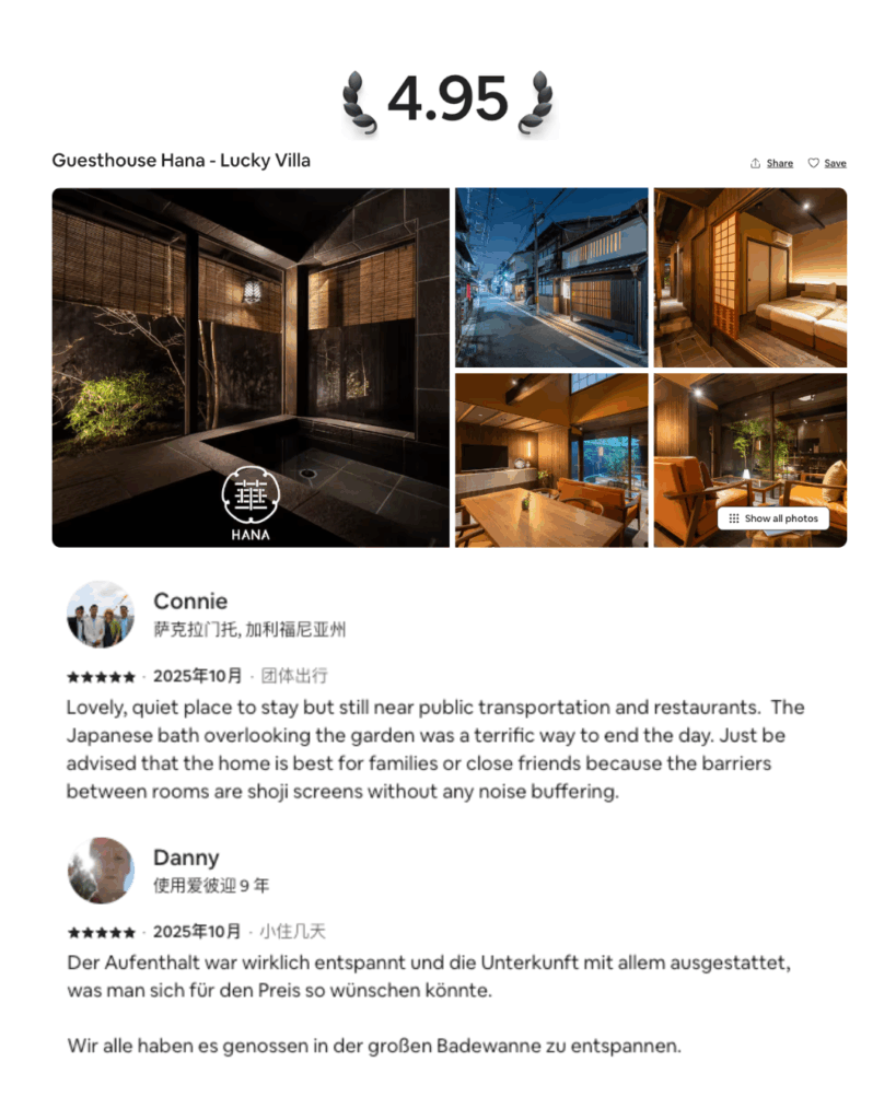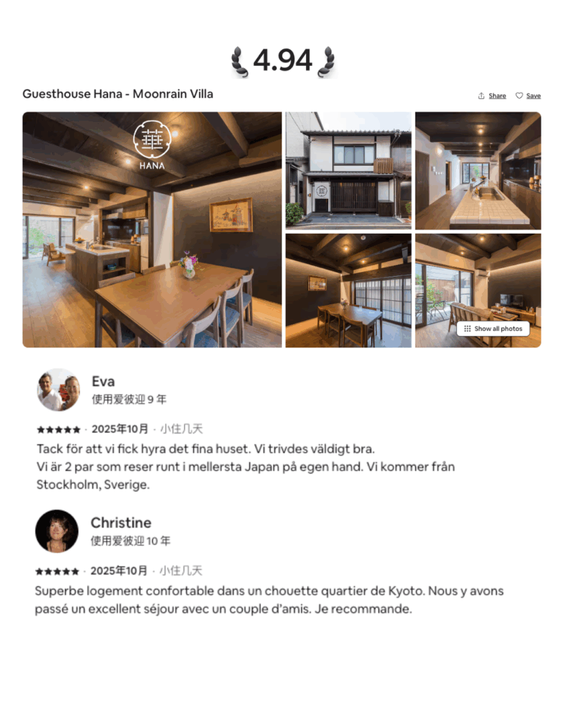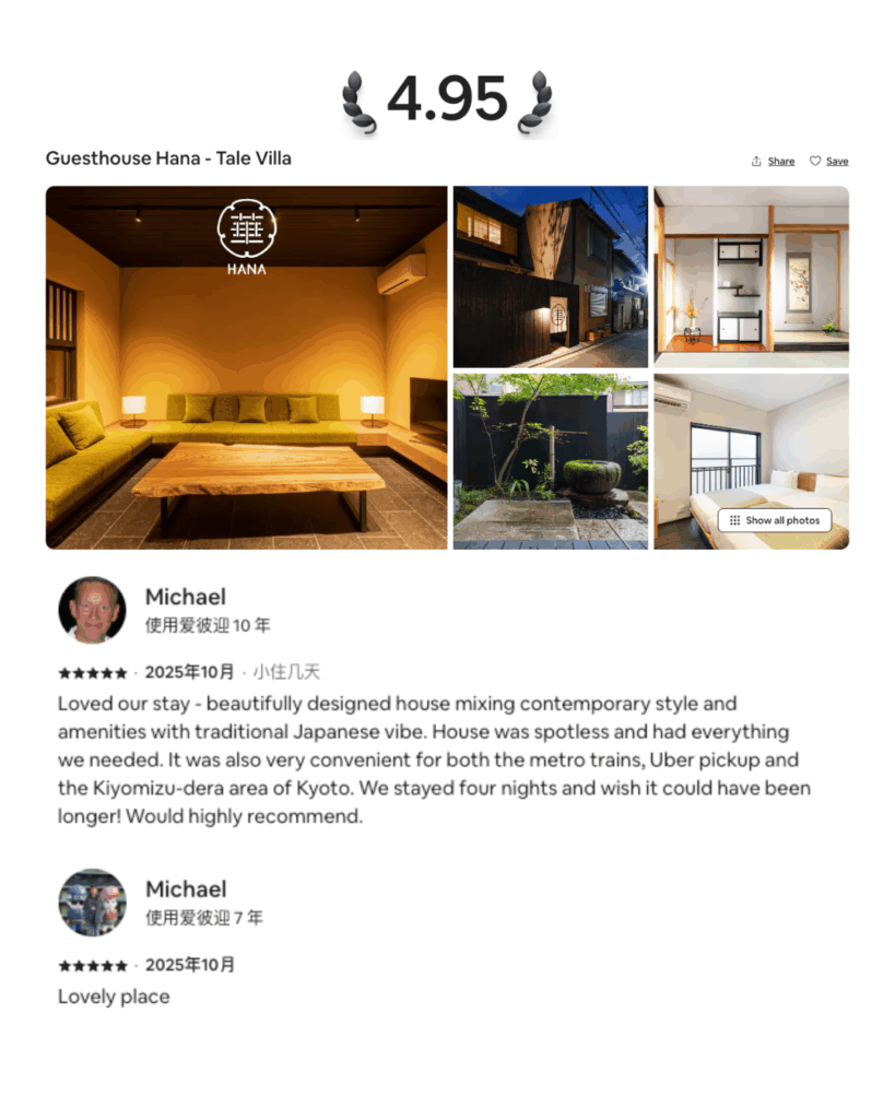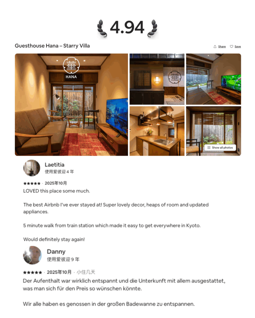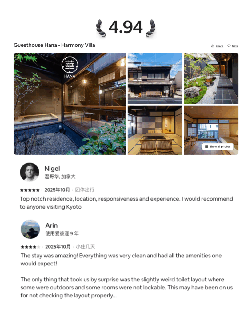在刚刚过去的十月,我们迎来了来自世界各地住客的温暖留言。本年度九月,Hana品牌累积在 Airbnb 上收获了 1,560 条真实住客评价,综合评分依旧保持在令人自豪的 4.94 高分。进入十月,我们新增了 48 条评价,整体评分仍稳稳保持 4.94,再一次证明了住客对我们空间、服务与体验的一致认可。